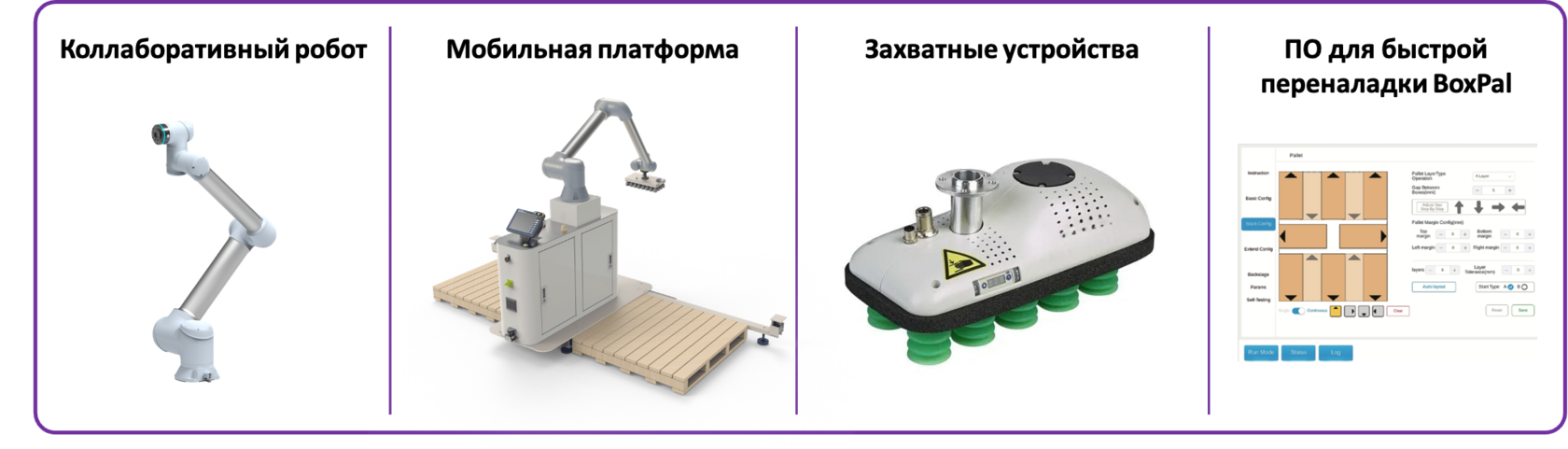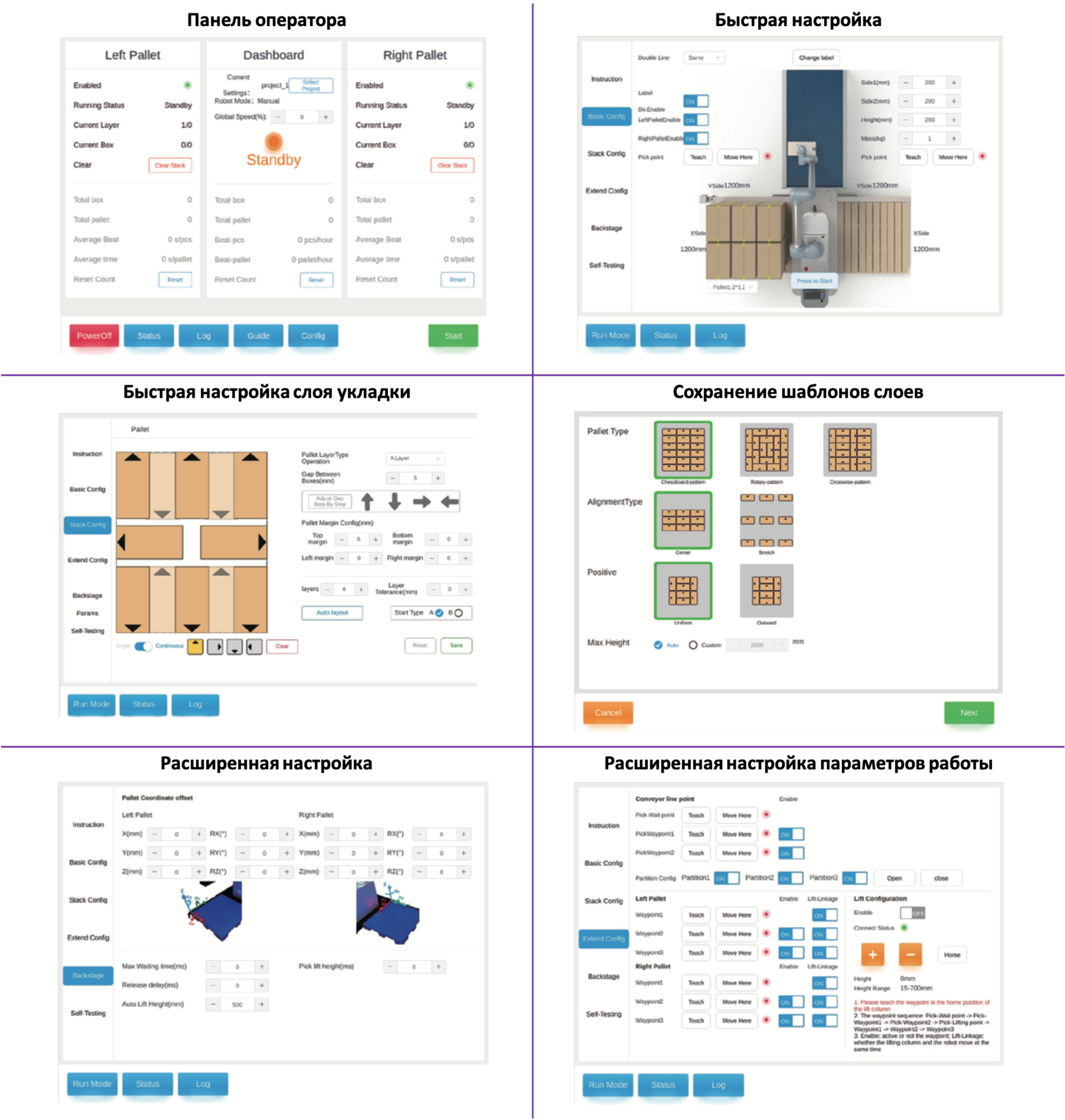 Простота эксплуатации. Интуитивно понятная система управления позволяет операторам без специального образования быстро освоить работу с комплексом и самостоятельно менять программы паллетирования.